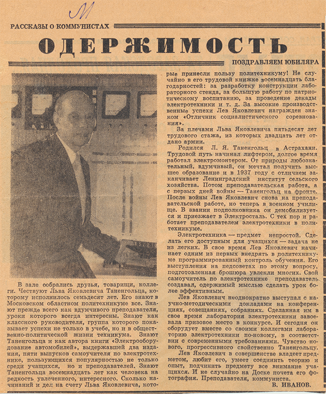 В зале собрались друзья, товарищи, коллеги. Чествуют Льва Яковлевича Таненгольца, которому исполнилось семьдесят лет. Его знают в Московском областном политехникуме все. Знают прежде всего как вдумчивого преподавателя, уроки которого всегда интересны. Знают как классного руководителя, группа которого показывает успехи не только в учебе, но и в общественно-политической жизни техникума. Знают Таненгольца и как автора книги «Электрооборудование автомобилей», выдержавшей два издания, пяти выпусков самоучителя по электротехнике, пользующихся популярностью не только среди учащихся, но и преподавателей. Знают Таненгольца восемнадцать лет как человека на редкость увлеченного, интересного. Сколько начинаний и дел на счету Льва Яковлевича, которые принесли пользу политехникуму! Не случайно в его трудовой книжке восемнадцать благодарностей: за разработку конструкции лабораторного стенда, за большую работу по патриотическому воспитанию, за проведение декады электротехники и т. д. За высокие производственные успехи Лев Яковлевич награжден знаком «Отличник социалистического соревнования».
